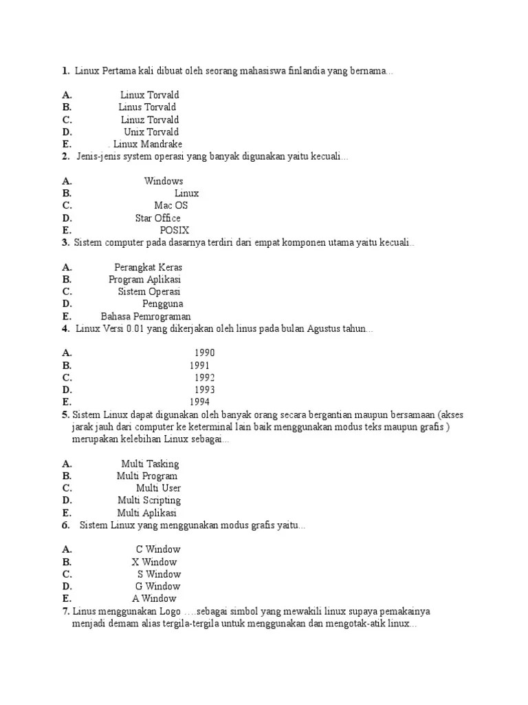 Soal linux dan jawabannya essay pg lengkap terbaru . Soal pilihan ganda dan jawaban sistem operasi 1. Kelebihan linux yang paling terkenal adalah lisensinya yang gratis, dan menjadi pilihan yang tepat untuk beberapa orang yang ingin . Saya akan membagikan 50 contoh soal tentang linux pilihan ganda berserta jawabannya. Linux generasi i merupakan sistem operasi berbasis teks.